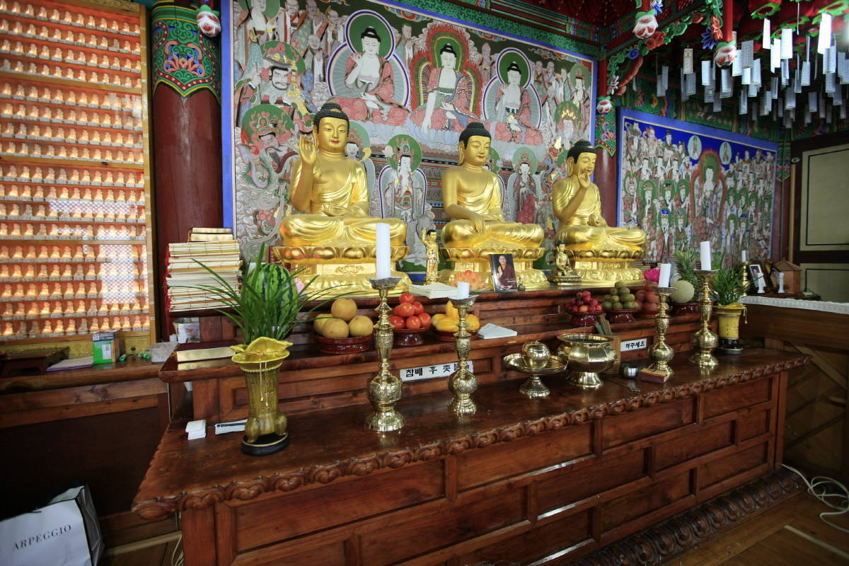 대웅전은 정면 3칸, 측면 2칸으로 내부에 삼세불상과 동종이 있다. 안쪽으로는 삼세후불, 칠성신중, 지장보살 등의 탱화가 봉안되어 있다.