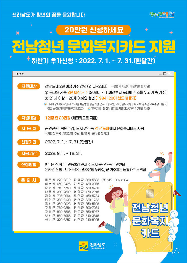 여수시(시장 정기명)가 ‘전남 청년 문화복지카드’ 지원 확대를 위해 거주요건을 변경하고 7월 한 달간 신청자를 추가 모집한다.